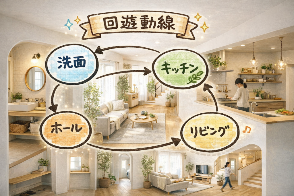 といったメリットがあります。たとえば、料理をしながら洗濯の様子を確認できる。帰宅後に玄関から洗面へ直行し、そのままリビングへ抜けられる。この“自然な流れ”ができることで、毎日の小さなストレスが減っていきます。冬場に室内で過ごす時間が長い石巻市では、動きやすさはそのまま快適性につながります。回遊動線はいざ住み始めてみて、その利便性を実感できる間取りです。